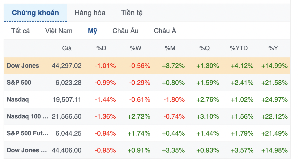 Kết thúc phiên giao dịch ngày 07/02, chỉ số Dow Jones lùi 444.23 điểm (tương đương 0.99%) xuống 44,303.40 điểm. Chỉ số S&P 500 mất 0.95% còn 6,025.99 điểm, và chỉ số Nasdaq Composite rớt 1.36% xuống 19,523.40 điểm. Đà giảm trong ngày thứ Sáu đã khiến các chỉ số chính ghi nhận mức giảm trong tuần này.