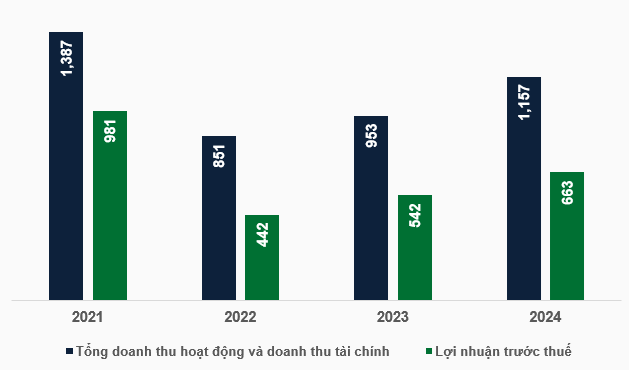 Nhìn lại năm 2024, khi tính đến phần doanh thu và lợi nhuận chưa thực hiện, bức tranh kinh doanh của FPTS hồi phục rõ nét. Cụ thể, tổng doanh thu hoạt động và doanh thu hoạt động tài chính đạt 1,157 tỷ đồng và lãi trước thuế 663 tỷ đồng, đều tăng trưởng trên 20% so với năm 2023. Nhìn rộng hơn, doanh thu và lợi nhuận của Công ty tăng trưởng đều sau khi chạm đáy vào năm 2022.