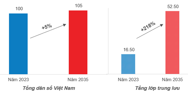 Bên cạnh đó, thu nhập bình quân của người dân cũng tăng đáng kể kèm theo nhu cầu và chi tiêu cho sức khoẻ cũng được gia tăng, đồng thời nhận thức của người dân trong chăm sóc sức khỏe ngày càng được nâng cao. Ngân hàng Thế giới (World Bank) và Bộ Kế hoạch và Đầu tư dự báo tầng lớp trung lưu Việt Nam đang gia tăng nhanh chóng, đến năm 2035, sẽ có một tỷ lệ dân số trung lưu là 50%.