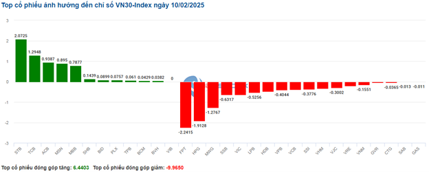 | Top 10 cổ phiếu tác động mạnh tới VN-Index phiên 10/02/2025 | ||