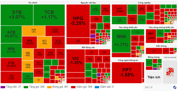 VN-Index mở cửa phiên chiều với áp lực bán tiếp gia tăng khiến cho chỉ số lao dốc không phanh và đóng cửa trong sắc đỏ bi quan. Về mức độ ảnh hưởng, HPG, FPT, VCB và VHM là những mã có tác động tiêu cực nhất khi lấy đi hơn 5.2 điểm của chỉ số. Ở chiều ngược lại, STB, MSN, BCM và MBB là những mã vẫn níu giữ được sắc xanh và đóng góp hơn 1.3 điểm vào chỉ số chung.