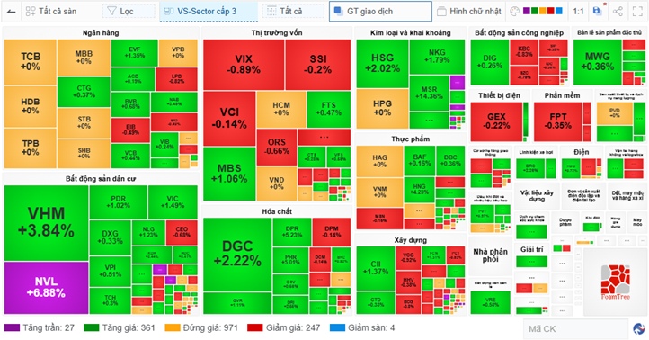 Đóng góp chủ đạo vào mức tăng của chỉ số hôm nay đến từ các nhóm ngân hàng, chứng khoán, bất động sản dân cư và hóa chất. Trong khi các nhóm ghi nhận các mức tăng khá đồng đều thì bất động sản dân cư lại chứng kiến nhiều cổ phiếu tăng giá nổi bật và thu nhiều sự chú ý, như bộ đôi VHM tăng 3.71% và VIC tăng 1.36%, thậm chí NVL tăng trần sau khi Quốc hội ban hành Nghị quyết về cơ chế đặc thù nhằm tháo gỡ vướng mắc tại dự án ở địa chỉ số 39-39B Bến Vân Đồn (TPHCM), hay còn được biết đến với tên thương mại The Tresor do Công ty này làm chủ đầu tư.