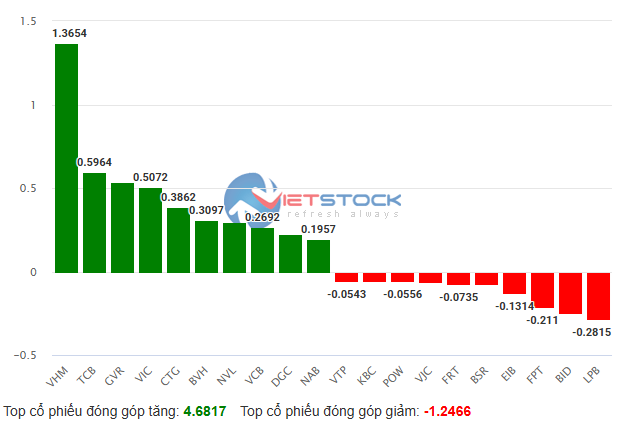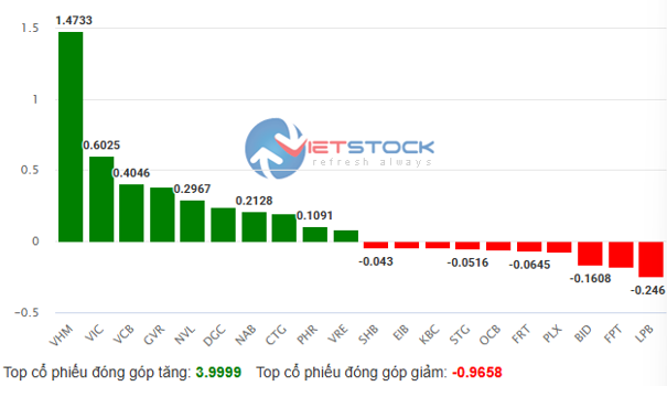 Trên VN-Index, loạt cổ phiếu bất động sản như VHM, VIC, NVL hay ngân hàng như TCB, CTG, VCB, NAB cùng nhau đóng góp tích cực vào điểm tăng của chỉ số, trong đó VHM dẫn đầu với gần 1.4 điểm mang lại.