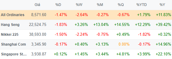 Tuy vậy, trên các thị trường lớn của châu Á lại đang có nhịp mở cửa không tích cực như vậy, với All Ordinaries giảm 1.47%, Hang Seng giảm 1.83%, Nikkei 225 giảm 1.5%, Shanghai Composite giảm 0.17%.