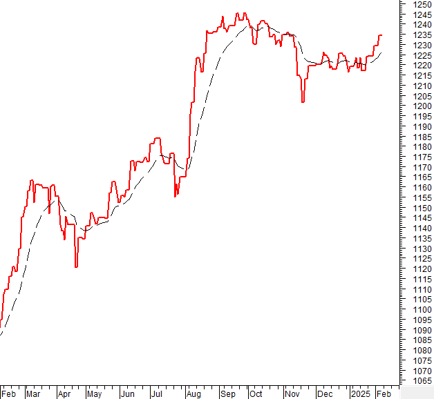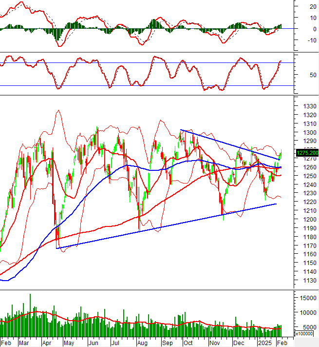 VN-Index tiếp nối đà tăng với 3 tuần tăng điểm liên tiếp kể từ khi vượt lên trên đường SMA 200 tuần. Bên cạnh đó, khối lượng giao dịch vượt lên trên mức trung bình 20 tuần kể từ giữa tháng 11/2024. Điều này chứng tỏ dòng tiền tham gia đang có chuyển biến tích cực. Hiện tại, chỉ báo MACD vừa cho tín hiệu mua sau khi cắt lên trên Signal Line. Nếu trạng thái này tiếp tục giữ vững trong thời gian tới thì triển vọng ngắn hạn vẫn còn lạc quan.