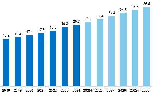 Theo Statista, doanh thu thị trường sữa Việt Nam dự kiến sẽ đạt 4.59 tỷ USD vào năm 2025. Trong giai đoạn 2025-2030, thị trường này có thể phát triển với tốc độ tăng trưởng kép (CAGR) ước tính khoảng 8.21%. Cùng với đó, mức tiêu thụ sữa bình quân đầu người tại Việt Nam dự kiến sẽ đạt 21.5 kg vào năm 2025, cho thấy nhu cầu ngày càng gia tăng đối với các sản phẩm dinh dưỡng thiết yếu này.