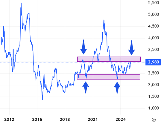 Theo đồ thị giá SMP (Skim Milk Powder), chúng ta thấy đà giảm của giá nguyên liệu sản xuất sữa bột gầy bắt đầu từ tháng 3/2022 đã kết thúc đồng thời tạo đáy tại vùng 2,240-2,360 USD/MT và bước vào xu hướng hồi phục.