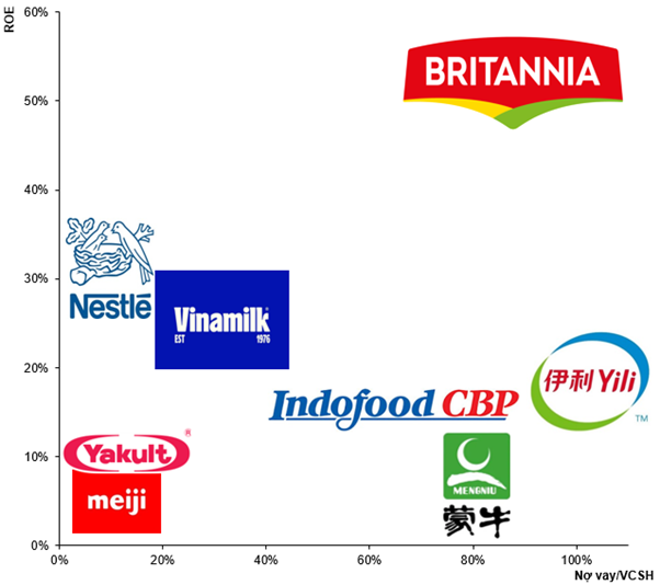 Các doanh nghiệp hàng đầu Trung Quốc, Indonesia như China Mengniu Dairy Co, Inner Mongolia Yili Industrial Group Co Ltd và Indofood Cbp Sukses Makmur Tbk đều có tỷ lệ Nợ vay/VCSH cao nhưng tỷ suất sinh lời không quá ấn tượng.