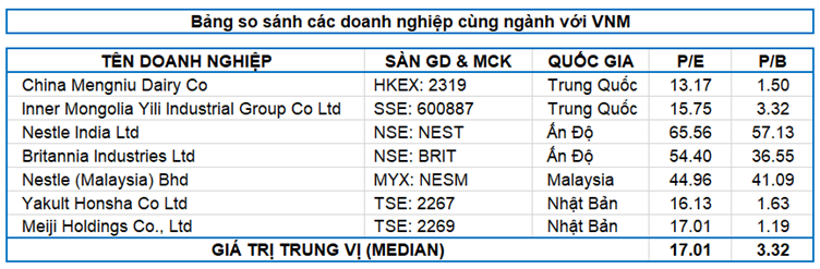 Do VNM đang sở hữu vị trí dẫn đầu trong ngành sữa ở Việt Nam nên không có so sánh tương đương từ các cổ phiếu đang giao dịch trên HOSE, HNX và UPCoM. Chính vì vậy, việc sử dụng các cổ phiếu nội địa làm mẫu so sánh ngang để định giá VNM sẽ không được hợp lý và toàn diện.