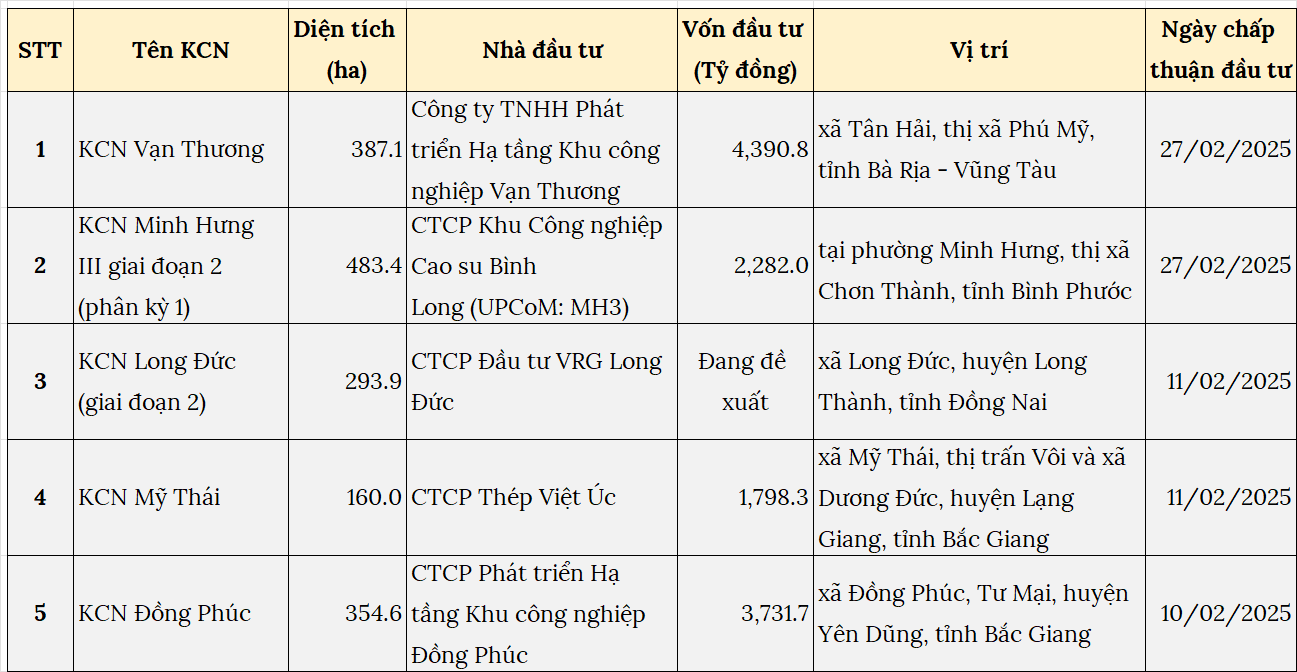 Các KCN được chấp thuận chủ trương đầu tư trong tháng 2/2025