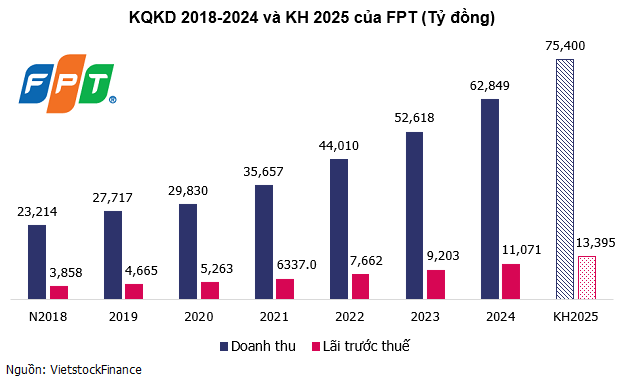 Thực tế, FPT duy trì tăng trưởng doanh thu và lợi nhuận 2 con số liên tục từ năm 2019-2024 và kỳ vọng tiếp tục đà tăng trưởng trong năm 2025. Cụ thể, Công ty đặt mục tiêu doanh thu 75,400 tỷ đồng và lãi trước thuế 13,395 tỷ đồng, tăng 20% và 21% so với thực hiện 2024. Đây đều là các con số kỷ lục trong lịch sử hoạt động của FPT.