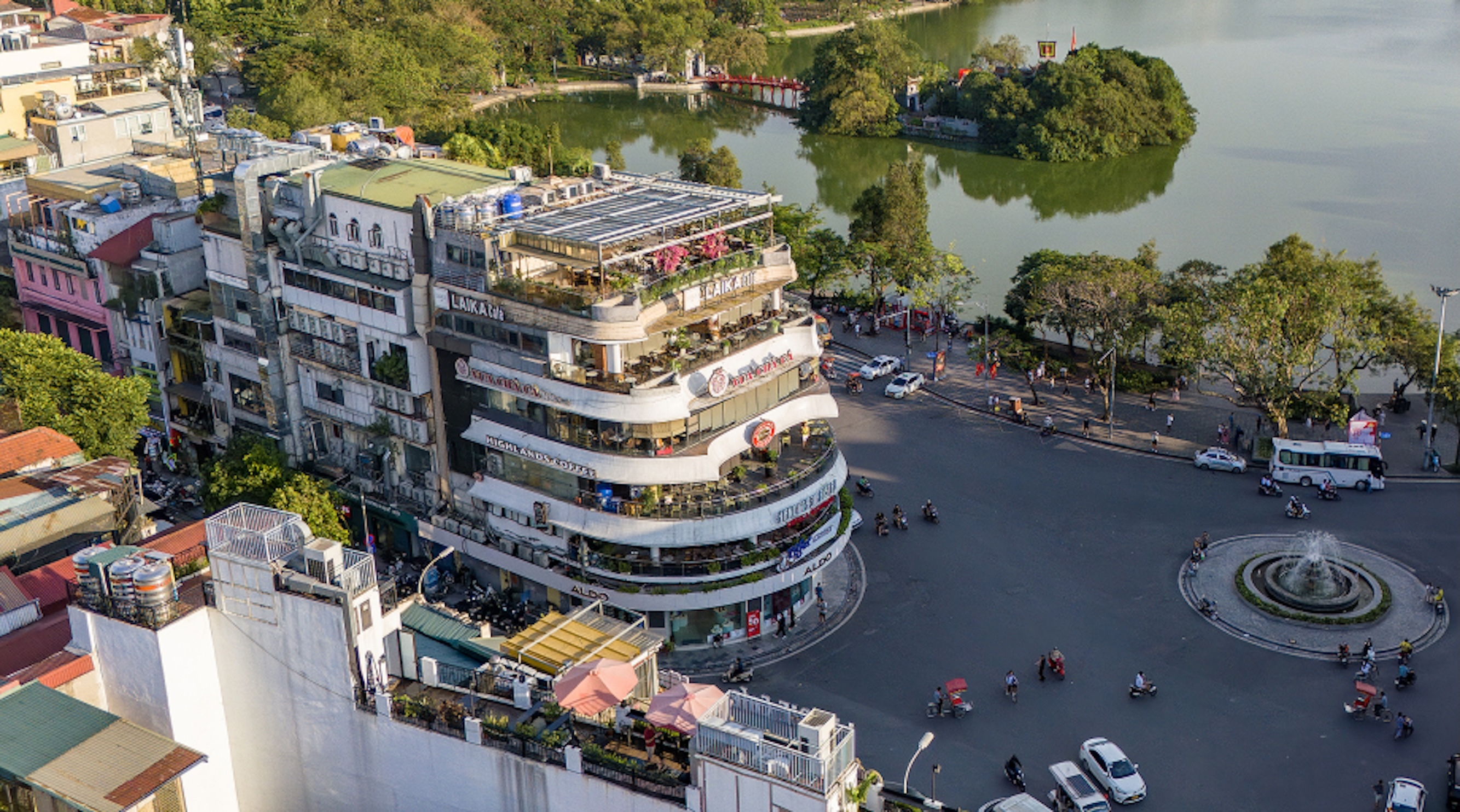 Tòa nhà "Hàm cá mập" nhìn ra quảng trường Đông Kinh Nghĩa Thục. Ảnh: Vne