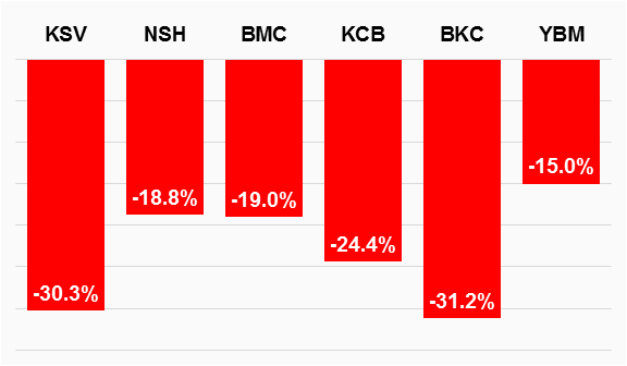Nhưng sau bữa tiệc là trận đòn của những phiên giảm sàn. Hầu hết các mã trên đã tạo đỉnh đồng loạt đến nay, và thậm chí KSV, BKC, YBM và KCB đã rớt giá hàng chục phần trăm.