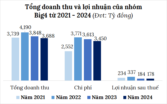 Năm tài chính 2024, tổng lợi nhuận nhóm Big4 đạt 178 tỷ đồng, giảm 3% so với năm trước.