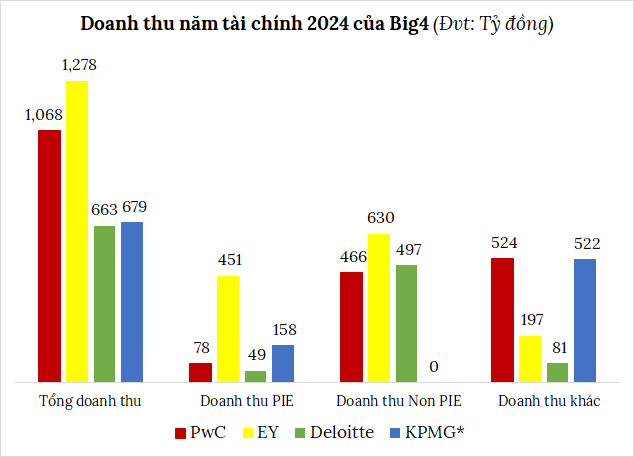 Riêng KPMG mạnh về kiểm toán, tư vấn vận hành, tư vấn thương vụ, tư vấn thuế và pháp lý, cơ cấu doanh thu nằm phần lớn từ dịch vụ khác gần 522 tỷ đồng; trong khi doanh thu PIE gần 158 tỷ đồng và không ghi nhận doanh thu Non PIE.