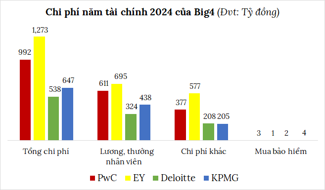 Đứng đầu chi phí là EY với gần 1,273 tỷ đồng, công ty kiểm toán này cũng trả lương cao nhất gần 695 tỷ đồng.