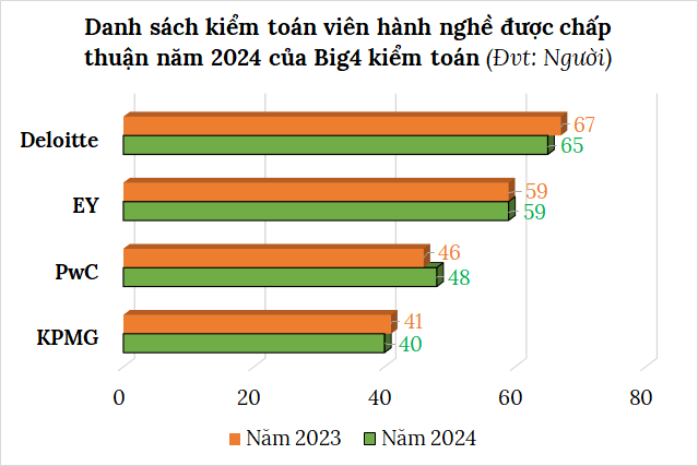 Trong nhóm Big4, tổng số kiểm toán viên hành nghề được chấp thuận năm 2024 là 212 người, giảm 1 người so với năm trước.