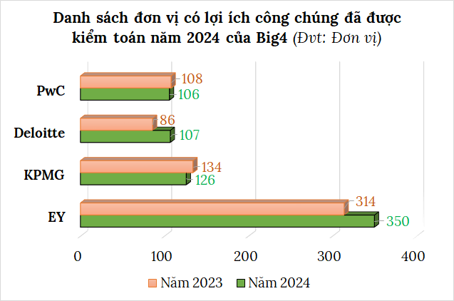 Đối với danh sách đơn vị có lợi ích công chúng đã được kiểm toán, EY đã hoàn thành kiểm toán cho 350 đơn vị, KPMG 126 đơn vị, Deloitte và PwC lần lượt là 107 và 106 đơn vị.