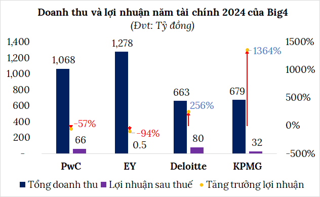 Trái ngược, KPMG năm trước đó lợi nhuận thấp nhất thì 2024 có lợi nhuận tăng trưởng mạnh nhất đạt 32 tỷ đồng, gấp 14.6 lần. Deloitte đạt lợi nhuận sau nhất, 80 tỷ đồng, gấp 3.6 lần.