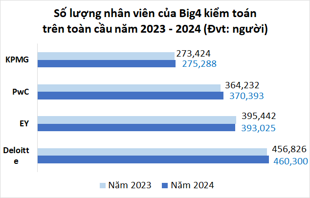 Big4 kiểm toán phụ thuộc lớn vào mảng dịch vụ tư vấn để tăng trưởng. Theo dữ liệu từ Statista, tổng doanh thu toàn cầu năm 2024 của nhóm này đạt kỷ lục hơn 212 tỷ USD, tăng 4% so với năm trước. Trong đó, Deloitte đóng góp nhiều nhất với hơn 67 tỷ USD, PwC hơn 55 tỷ USD, EY hơn 51 tỷ USD và KPMG hơn 38 tỷ USD.