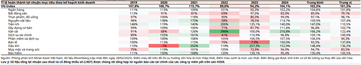 Các ngành vận tải, bán lẻ và dầu khí ghi nhận biến động cao hơn với tỷ lệ hoàn thành trung vị lần lượt 122%, 138%, và 136%, phản ánh tâm lý thận trọng trong việc thiết lập mục tiêu của ban lãnh đạo.