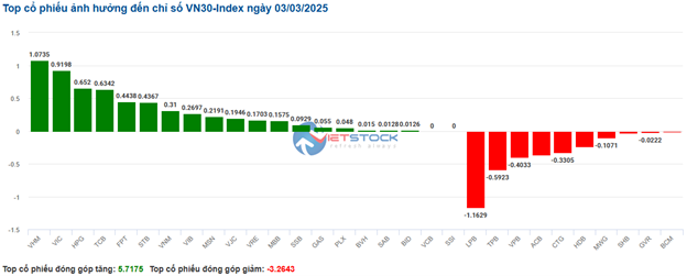 | Top 10 cổ phiếu tác động mạnh tới VN-Index phiên 03/03/2025 | ||