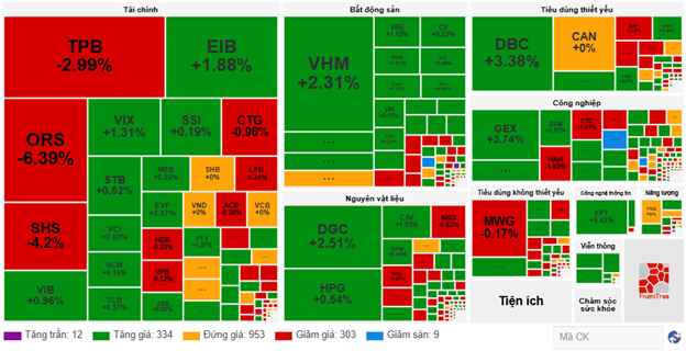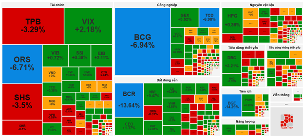 Ở chiều ngược lại, thị trường vẫn đang chịu sự tác động không mấy tích cực từ nhóm ngành tài chính. Trong đó, tiêu biểu là các mã cổ phiếu như ORS giảm 6.39%, SHS giảm 4.2%, TPB giảm 2.99%, CTG giảm 1.08%, ACB giảm 0.38%,…