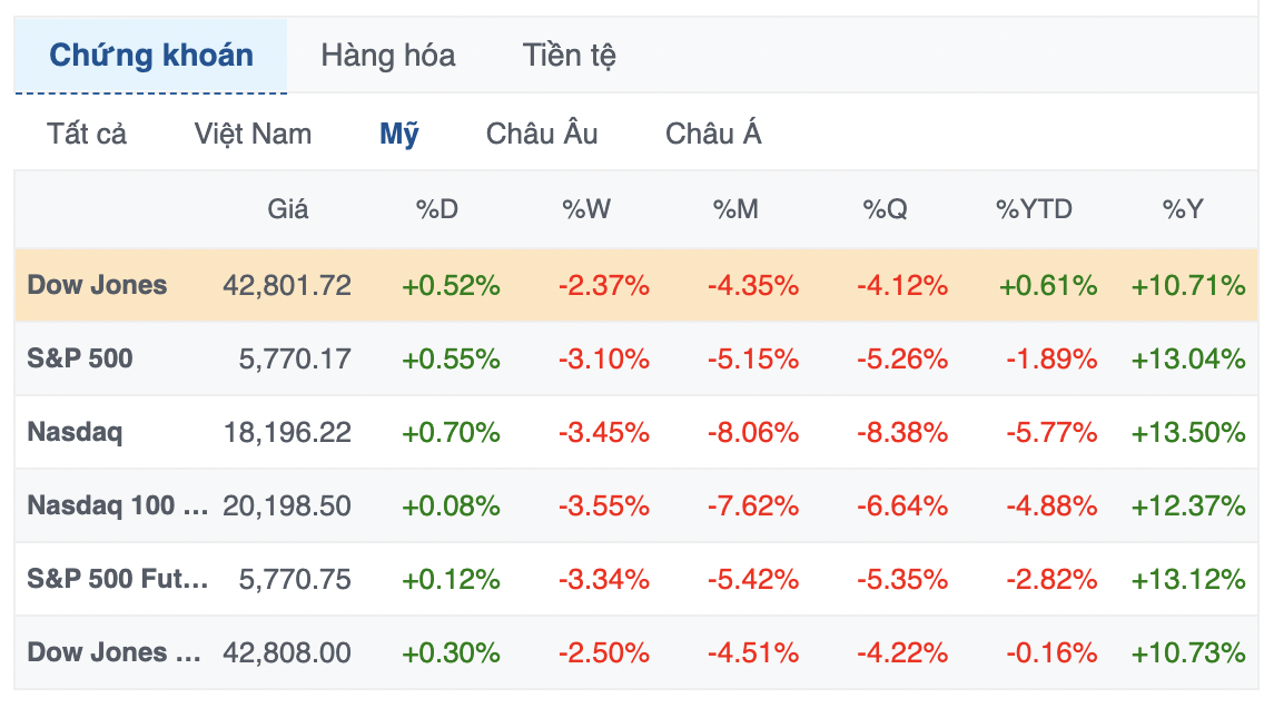 Kết thúc phiên giao dịch ngày 07/3, chỉ số S&P 500 tiến 0.55% lên 5,770.20 điểm, còn chỉ số Nasdaq Composite cộng 0.7% lên 18,196.22 điểm. Chỉ số Dow Jones tăng 222.64 điểm (tương đương 0.52%) lên 42,801.72 điểm.