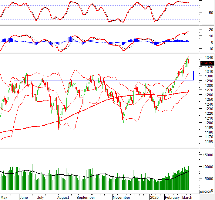VN-Index chững lại đà tăng với phiên giảm mạnh đồng thời cắt đứt chuỗi 5 phiên liên tiếp tăng điểm gần đây. Bên cạnh đó, khối lượng giao dịch tăng cao trên mức trung bình 20 ngày cho thấy áp lực bán mạnh đang diễn ra. Hiện tại, VN-Index vẫn nằm trên đỉnh cũ tháng 6/2024 (tương đương vùng 1,290-1,310 điểm). Đây được xem là ngưỡng hỗ trợ quan trọng mà VN-Index không được phép phá vỡ nếu muốn duy trì sự lạc quan. Mặt khác, chỉ báo Stochastic Oscillator đã cho tín hiệu bán trở lại trong vùng quá mua (overbought). Nhà đầu tư nên cẩn trọng hơn trong quyết định đầu tư nếu chỉ báo rơi khỏi vùng này.
