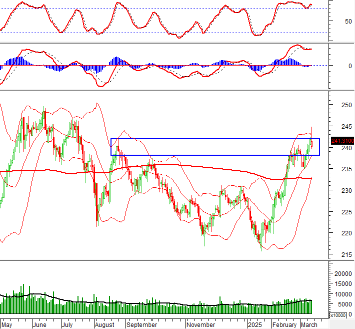 Mặt khác, chỉ số đang quay lại test đỉnh cũ tháng 8/2024 (tương đương vùng 238-242 điểm). Nếu trong các phiên tới, chỉ số giữ vững trên ngưỡng này thì tình hình sẽ không quá bi quan.
