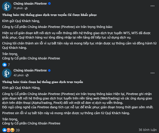 Cụ thể, Công ty ghi nhận gián đoạn kết nối hệ thống giao dịch trực tuyến trên nền tảng web (WebTrading) và các ứng dụng giao dịch trên điện thoại (AlphaTrading, PineX) đối với một số đơn vị dịch vụ viễn thông. Kèm theo thông báo sự cố, Công ty cho biết đội ngũ công nghệ đang nỗ lực để khắc phục gián đoạn kèm lời xin lỗi và mong nhận được sự thông cảm từ khách hàng.