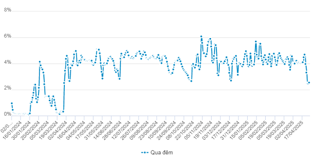 Lãi suất liên ngân hàng kỳ hạn qua đêm tăng nhẹ 7 điểm cơ bản, lên 2.54%/năm vào cuối phiên 28/04. Tuy nhiên, đây vẫn là mức thấp nhất trong vòng 1 năm, tính từ ngày 09/04/2024. Khối lượng giao dịch qua đêm trên thị trường liên ngân hàng tăng 37% so với tuần trước.