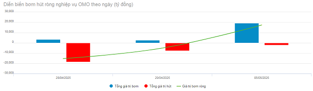 Diễn biến bơm hút ròng nghiệp vụ OMO tuần qua (28/04-05/05/2025). Đvt: Tỷ đồng