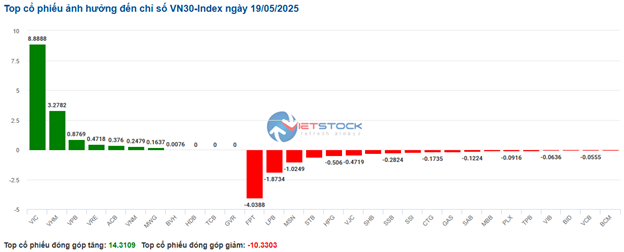 | Top 10 cổ phiếu tác động mạnh tới VN-Index phiên 19/05/2025 | ||