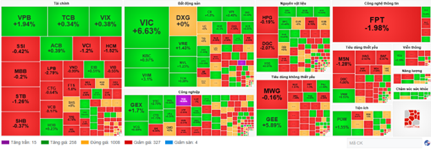 So với đầu phiên, bên bán vẫn chiếm ưu thế hơn. Số mã giảm là 327 mã và số mã tăng là 258 mã.