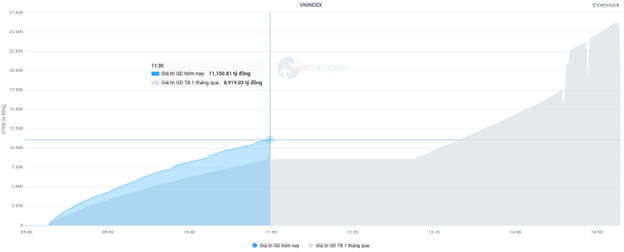 Khối lượng giao dịch của VN-Index đạt hơn 437 triệu đơn vị trong phiên sáng, tương đương giá trị hơn 11 ngàn tỷ đồng, cao hơn 24% so với mức trung bình 1 tháng qua. HNX-Index ghi nhận khối lượng đạt gần 29 triệu đơn vị với giá trị hơn 464 tỷ đồng.