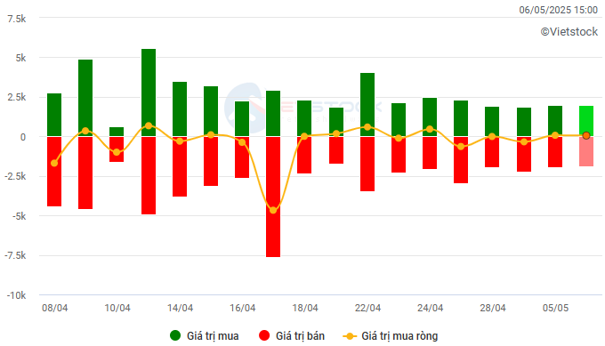 Biến động của dòng tiền từ khối ngoại: Khối ngoại quay lại mua ròng trong phiên giao dịch ngày 06/05/2025. Nếu nhà đầu tư nước ngoài duy trì hành động này trong những phiên tới thì tình hình sẽ càng lạc quan hơn.
