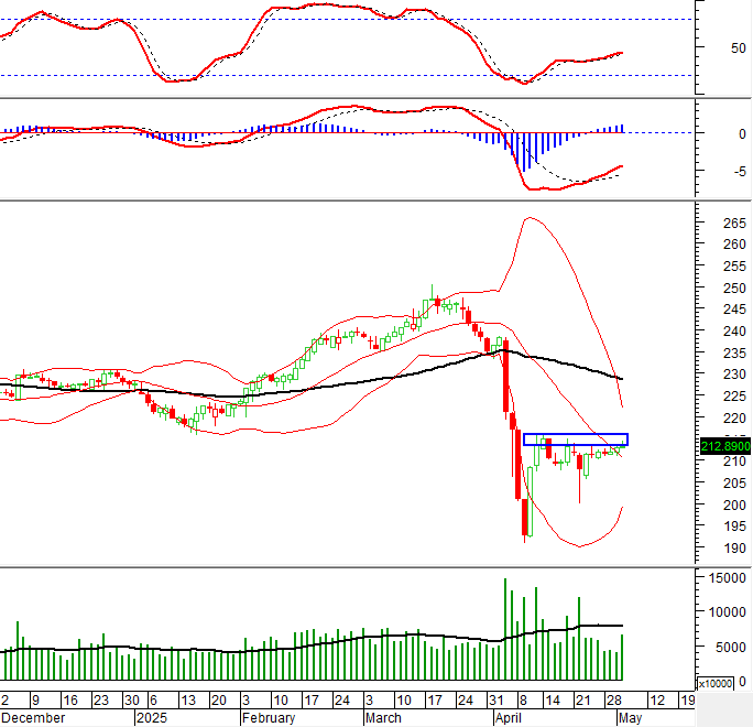 HNX-Index tăng điểm đồng thời vẫn đang giữ vững trên đường Middle của Bollinger Bands. Tuy nhiên, sự xuất hiện mẫu hình nến Inverted Hammer cho thấy tâm lý nhà đầu tư khá bi quan. Hiện tại, chỉ số đang có xu hướng tiến đến vùng kháng cự tiếp theo được hình thành vào giữa tháng 4/2025 (tương đương vùng 213-216 điểm). HNX-Index cần phá vỡ khỏi vùng này kèm theo thanh khoản có sự cải thiện nếu muốn duy trì đà tăng trong thời gian tới.
