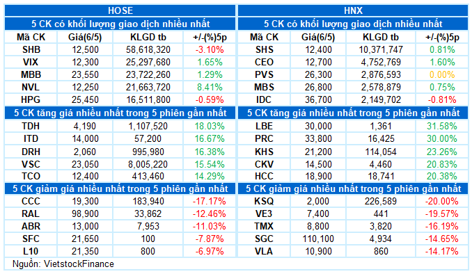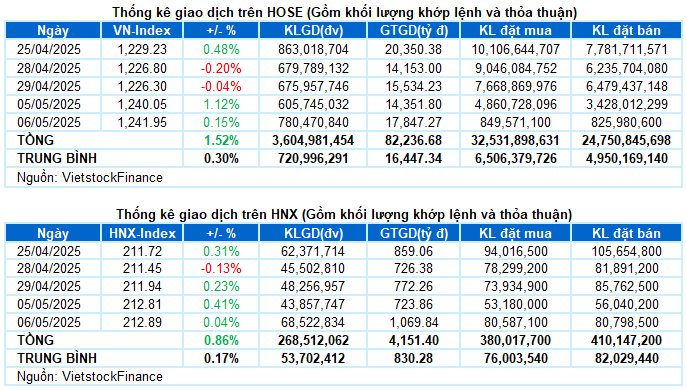 - Phiên giao dịch ngày 06/05 khởi đầu với tín hiệu tích cực khi thanh khoản được cải thiện rõ rệt, dòng tiền chủ động nhập cuộc sớm giúp sắc xanh nhanh chóng lan tỏa trên diện rộng. Đà tăng được duy trì khá ổn định trong suốt phiên sáng và kéo dài đến đầu phiên chiều, với VN-Index có thời điểm tăng hơn 10 điểm. Tuy nhiên, áp lực chốt lời bất ngờ gia tăng vào nửa cuối phiên chiều khiến chỉ số quay đầu, đánh mất phần lớn thành quả trước đó. Kết phiên, VN-Index chỉ còn nhích nhẹ gần 2 điểm, đóng cửa tại 1.241,95 điểm.