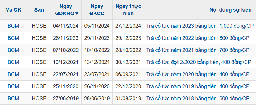 Phương án này đã được thông qua tại ĐHĐCĐ thường niên 2025. Theo đó, BCM dự kiến phát hành 113.85 triệu cp, tỷ lệ thực hiện quyền 100:11, tương ứng cổ đông sở hữu 100 cp sẽ nhận được 11 cp mới, đây cũng là mức chi trả cổ tức cao nhất của Doanh nghiệp.
