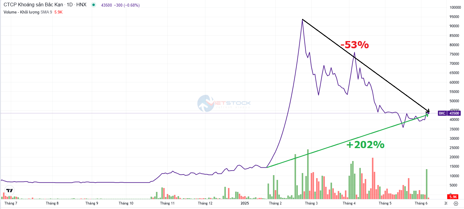 Trên sàn chứng khoán, giá cổ phiếu BKC bất ngờ tăng trần lên 43,800 đồng/cp trong phiên 05/06, với thanh khoản đạt hơn 140,000 cp. Trước đó, mã này từng bứt phá từ vùng giá 14,000 đồng/cp vào cuối tháng 1/2025 lên đỉnh lịch sử hơn 93,000 đồng/cp cuối tháng 2 - tăng gần 550% chỉ trong 1 tháng. Đáng chú ý, cổ phiếu có chuỗi 18 phiên tăng liên tiếp, trong đó 17 phiên tăng trần, gồm 14 phiên trần liên tục. Tuy nhiên, sau đó, mã này liên tục điều chỉnh và hiện đã giảm 53% từ đỉnh, nhưng vẫn cao hơn 560% qua 1 năm. Dù vậy, thanh khoản bình quân khá thấp với chỉ khoảng 24,000 cp/phiên.