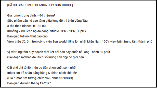 “Giá rumor trung bình: xấp xỉ 94 triệu/m2. Giá rumor tim tường, chưa VAT, chưa trừ CSBH. Bàn giao dự kiến tháng 12/2027”, một tin rao của môi giới trên batdongsan.com.vn cho hay.