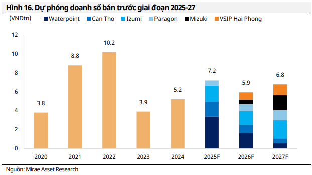 Các thủ tục pháp lý cần thiết đã hoàn tất, mở đường cho việc thương mại hóa dự án có giá trị cao. Bên cạnh Waterpoint và Cần Thơ – hai dự án đang mở bán, MAS kỳ vọng NLG sẽ sớm triển khai Mizuki và đặc biệt là Izumi, vốn bị trì hoãn do chờ phê duyệt quy hoạch 1/500. Với việc quy hoạch đã được thông qua ngày 11/06/2025, Công ty có thể đưa dự án ra thị trường ngay trong năm. Dựa trên giả định thận trọng về tiến độ và tỷ lệ hấp thụ (đặc biệt tại dự án Paragon và VSIP Hải Phòng), MAS dự phóng presales 2025 đạt 7,191 tỷ đồng – tương đương 49% kế hoạch nhưng vẫn tăng 38.3% so với cùng kỳ.