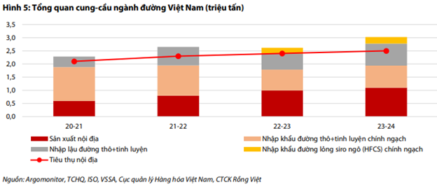 VDSC thông tin thêm, “thị trường đường tại Việt Nam tiếp tục hoàn cảnh thừa cung, trong đó các loại đường bất hợp pháp và đường nhập khẩu từ ASEAN tiếp tục làm chủ thị trường, khiến đường sản xuất từ mía hầu như không thể tiêu thụ được. Kho đường tại các nhà máy đều hết chỗ chứa” - ông Nguyễn Văn Lộc, Chủ tịch Hiệp hội Mía đường Việt Nam chia sẻ vào cuối tháng 3/2025. Theo quan sát của VDSC, hầu hết các doanh nghiệp đường đều ở trạng thái tồn kho lớn sau quý 1/2025 mặc dù đã chấp nhận hạ giá bán (thể hiện quả sụt giảm biên lợi nhuận gộp) để ra sản lượng.