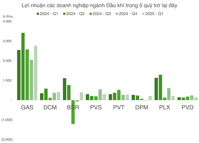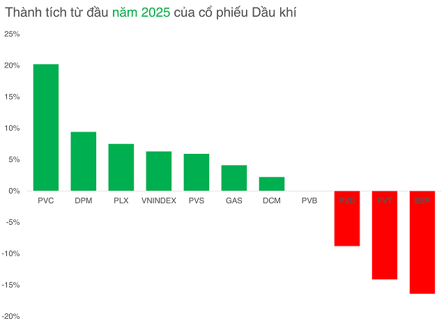 Sức bật đã được ghi nhận nhưng thực tế thành tích của nhóm vẫn bị triệt tiêu đáng kể do cú sốc thuế quan trong tháng 4. So với thành tích của chỉ số VN-Index (+6,3%) từ đầu năm 2025, các cổ phiếu PVS (+5,9%), GAS (+4,1%), DCM (+2,2%) đi sau về thành tích tăng trưởng trong khi PVD (-8,8%), PVT (-14,1%), BSR (-16,4%) còn đang đi lùi so với đầu năm.
