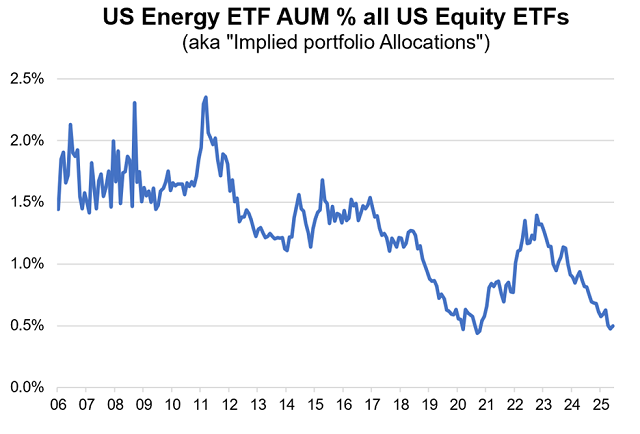 Tuy nhiên, dữ liệu từ Topdown Charts lại cho thấy dòng tiền phân bổ vào nhóm năng lượng hiện đang ở mức thấp nhất trong lịch sử. Điều này phản ánh sự thận trọng của nhà đầu tư toàn cầu trước xu hướng tăng trưởng kinh tế chậm lại và rủi ro thuế quan – vốn đang ảnh hưởng mạnh đến kỳ vọng về nhu cầu năng lượng.