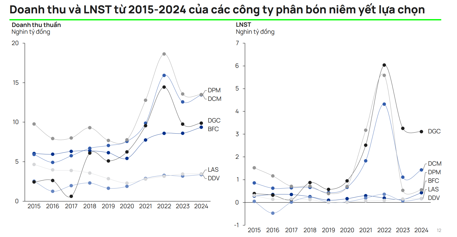 Trong báo cáo gần nhất, Chứng khoán Vietcap đã mở rộng phân tích tác động chính sách thuế lên nhiều doanh nghiệp trong ngành. Ngoài DPM và DCM được xác định là hai doanh nghiệp hưởng lợi lớn nhất, DAP – Vinachem (DDV) cũng được dự báo sẽ có cải thiện lợi nhuận mạnh nhờ được khấu trừ thuế đầu vào. Các doanh nghiệp khác như Supe Phốt phát và Hóa chất Lâm Thao (LAS) và Phân bón Bình Điền (BFC) cũng thuộc nhóm hưởng lợi nhưng có phần khiêm tốn hơn. Theo dự phóng từ Vietcap, lợi nhuận năm 2025 của LAS và DCM có thể tăng trưởng quanh mức 20%, trong khi Hóa chất Đức Giang (DGC) được dự báo đạt tăng trưởng lợi nhuận khoảng 10%. Với DPM, mức tăng trưởng lợi nhuận có thể lên tới 60%, phản ánh rõ tác động từ yếu tố thuế, giá khí đầu vào hạ nhiệt và giá bán urê được cải thiện.