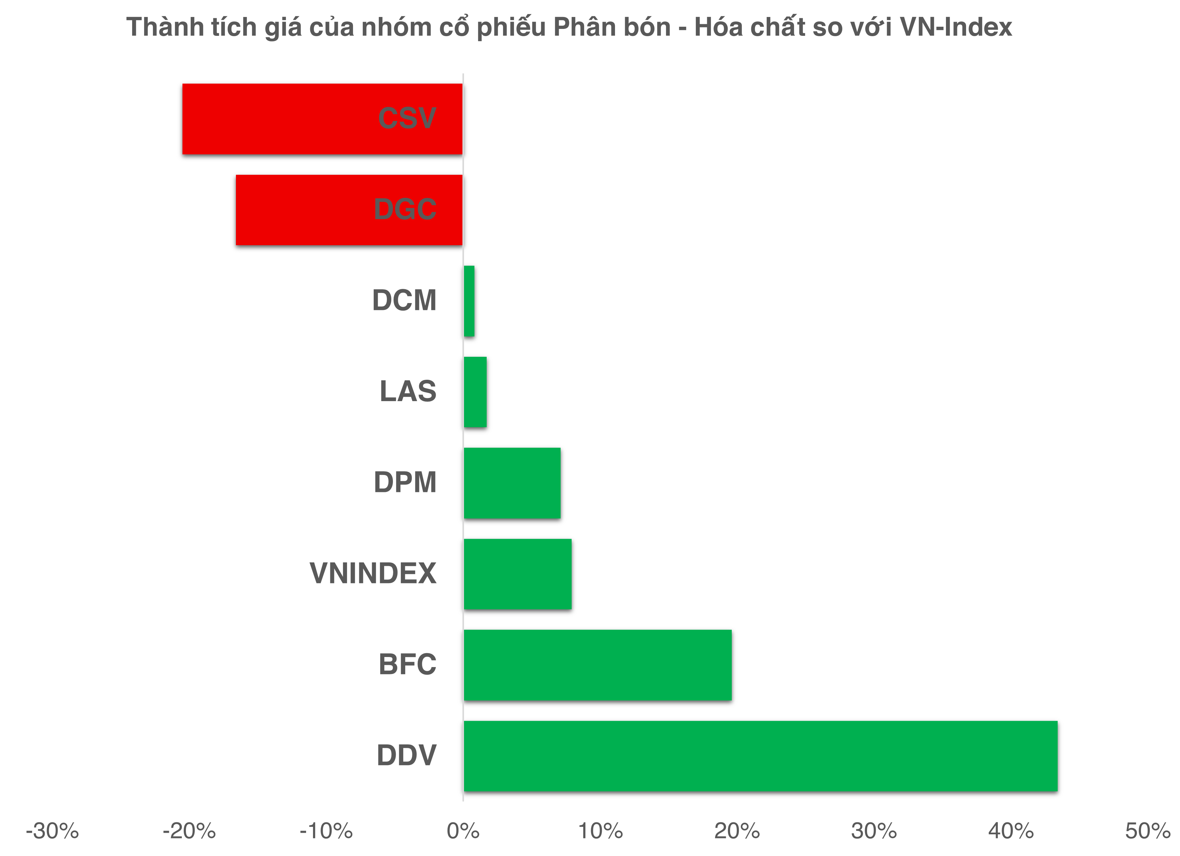 Ở chiều ngược lại, hai cổ phiếu của CTCP Hóa chất Đức Giang (DGC) và CTCP Hóa chất Cơ bản Miền Nam (CSV) đang giảm mạnh tính từ đầu năm, lần lượt -16.6% và -20.5%.