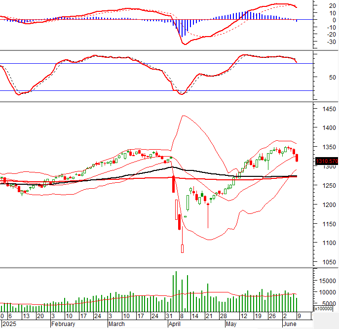 VN-Index giảm điểm phiên thứ 4 liên tiếp đồng thời cắt xuống dưới đường Middle của Bollinger Bands. Hiện tại, chỉ báo MACD tiếp tục đi xuống sau khi cho tín hiệu bán. Chỉ báo Stochastic Oscillator cũng cho tín hiệu tương tự và rời khỏi vùng quá mua (overbought). Những tín hiệu này cho thấy rủi ro điều chỉnh ngắn hạn của chỉ số vẫn còn tiếp diễn.