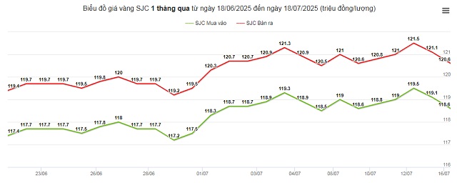 Biểu đồ giá vàng SJC 1 tháng qua từ ngày 18/06/2025 đến ngày 18/07/2025